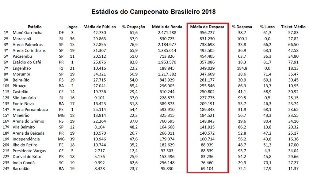 Obs: as despesas passaram de R$ 1 milhão em 2016 e 2017, mas quando o estádio só foi usado nos jogos finais.