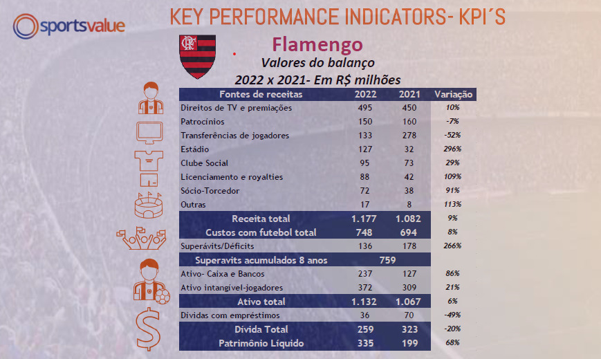 Além disso, o balanço analisado pela Sports Value mostrou que o valor da dívida do Flamengo em 2022 foi o mais baixo da história. Em comparação ao ano de 2021, o endividamento caiu de 375 para 259 milhões de reais.