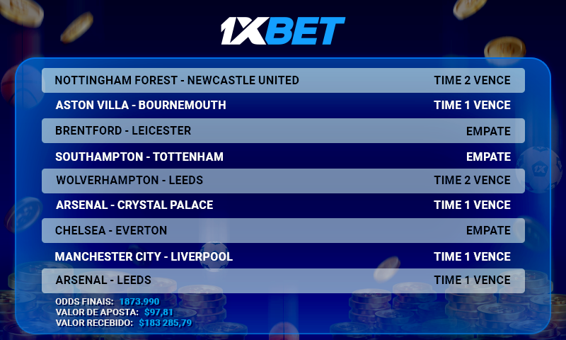 Todas as 9 partidas foram disputadas na Premier League inglesa. Os aficionados por apostas em futebol consideram que é o mais difícil de prever - a competição na liga mais rica do mundo é acirrada e os jogadores de fora geralmente vencem os favoritos. No entanto, o sortudo beninense acertou em suas previsões: com uma aposta de $ 97,81, ele obteve odds finais de 1.873,990 e ganhou $183.285,79!