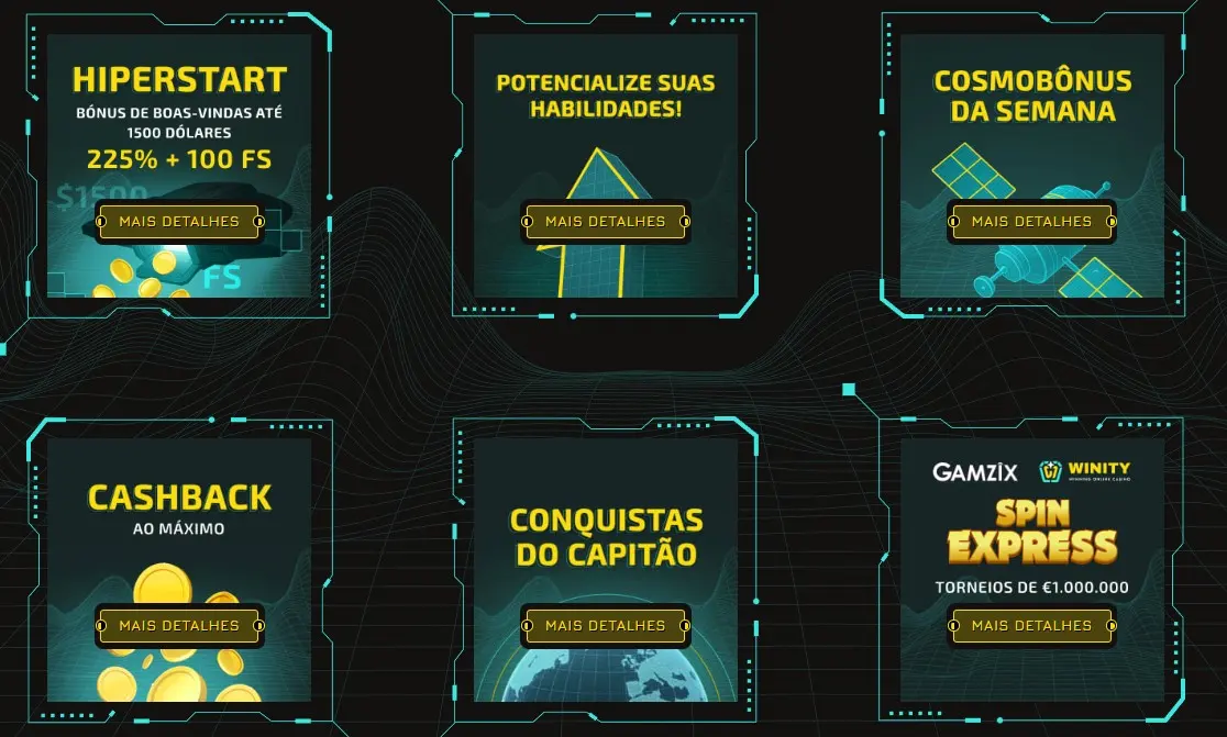 O cassino mantém o engajamento através dos Bônus Cósmicos Semanais, com um calendário fixo: segundas, quartas e sábados oferecem giros grátis vinculados a depósitos. As sextas-feiras focam em bônus de recarga para o final de semana, enquanto os domingos podem incluir bônus sem depósito para jogadores elegíveis.