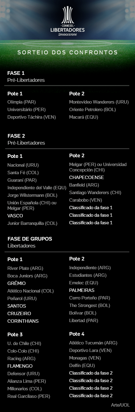 Por essa razão, Palmeiras e Flamengo não pegam Grêmio, Santos, Corinthians e Cruzeiro, todos estes cabeças de chave, mas obrigatoriamente terão como adversário ao menos uma dessas equipes, todas elas do pote 1: Boca Juniors (Argentina), River Plate (Argentina), Atlético Nacional (Colômbia) ou Peñarol (Uruguai). Veja como devem ficar os potes abaixo: